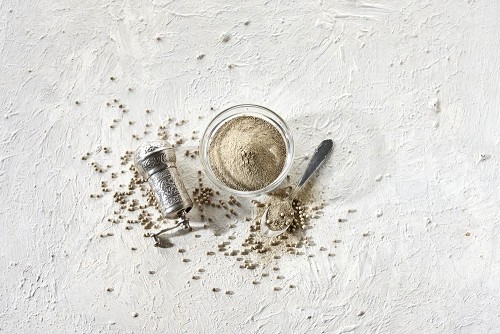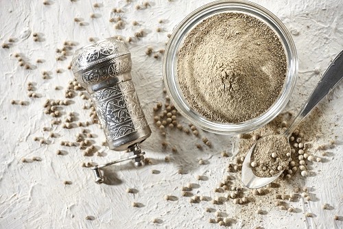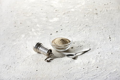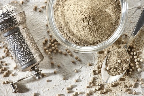A glass bowl full of white pepper powder with white pepper beads and a metal grinder on textured white flooring