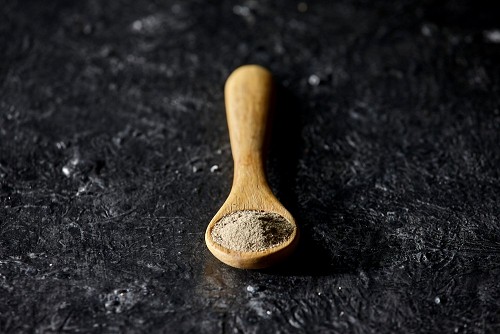 A wooden spoon full of white pepper powder on textured black flooring
