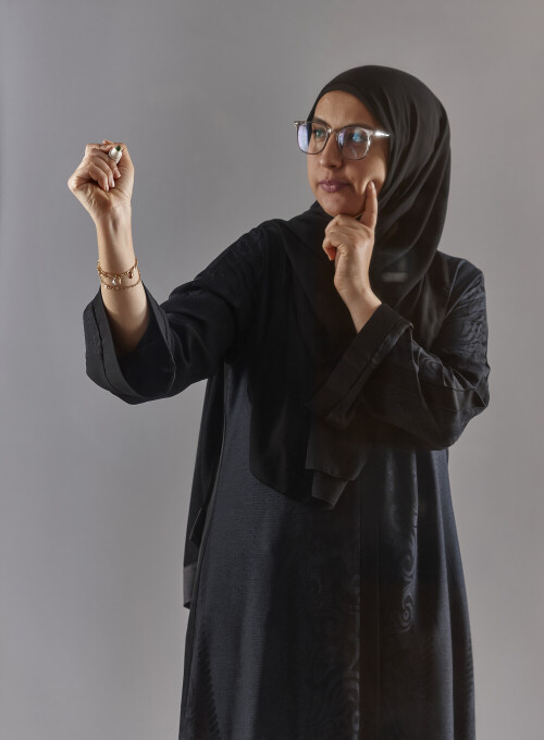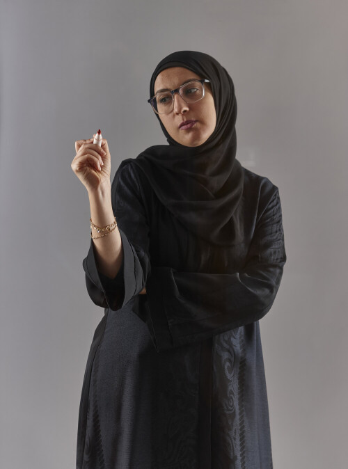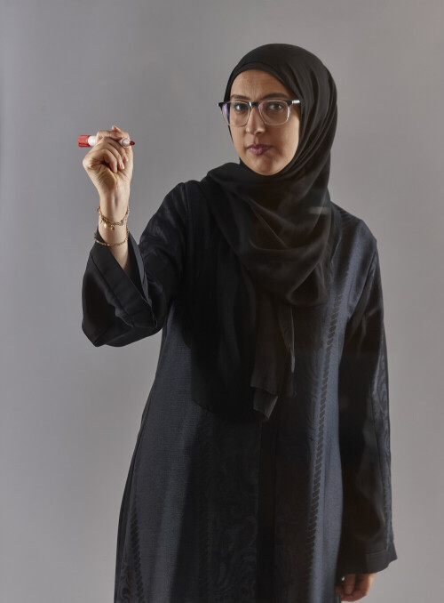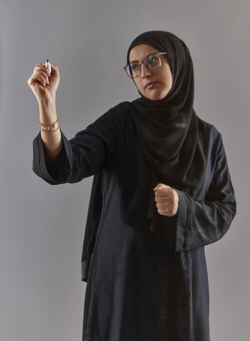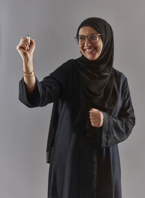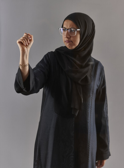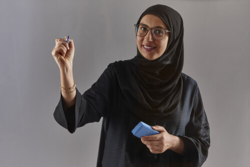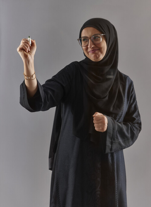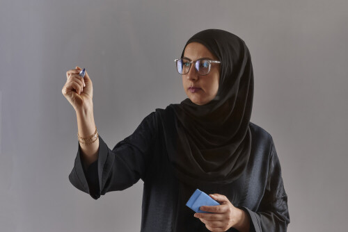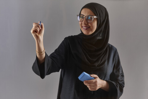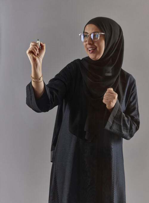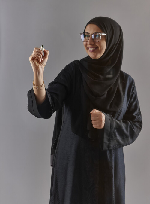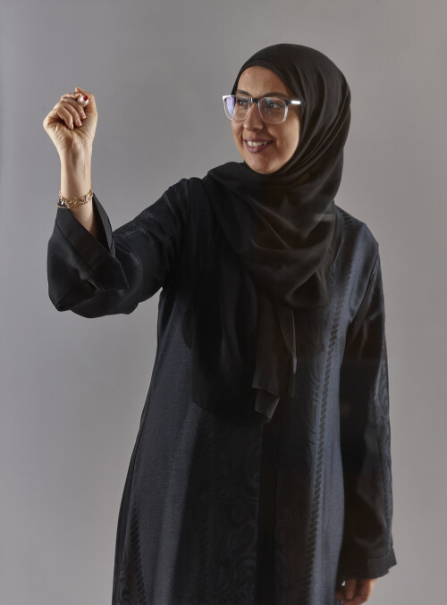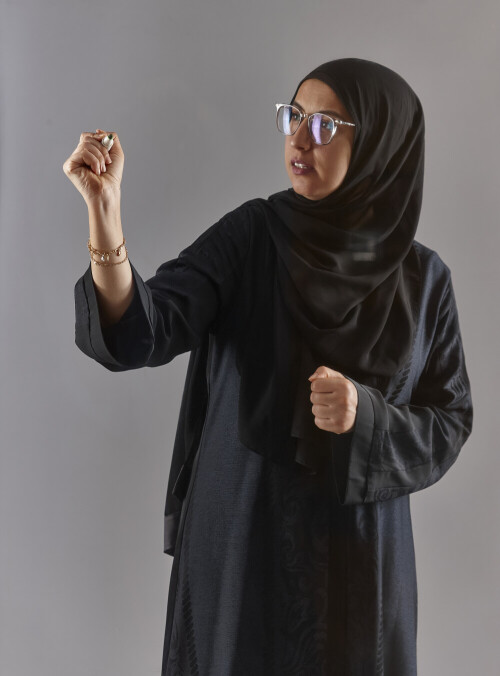 Woman in abaya writing on transparent board