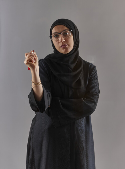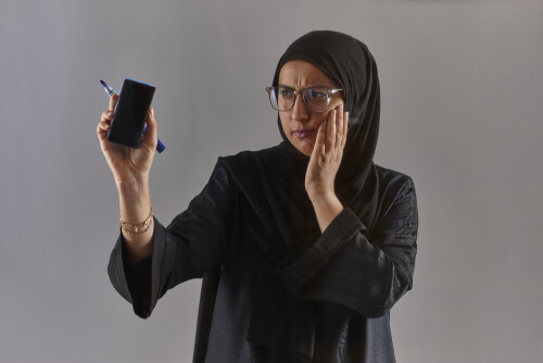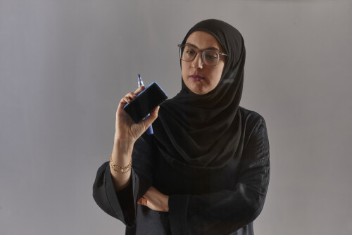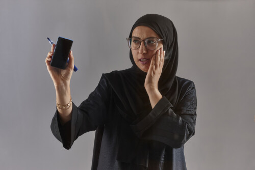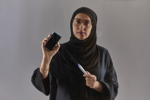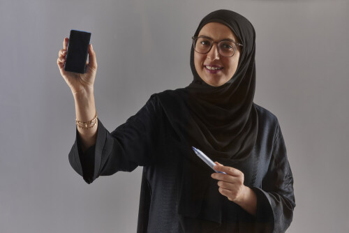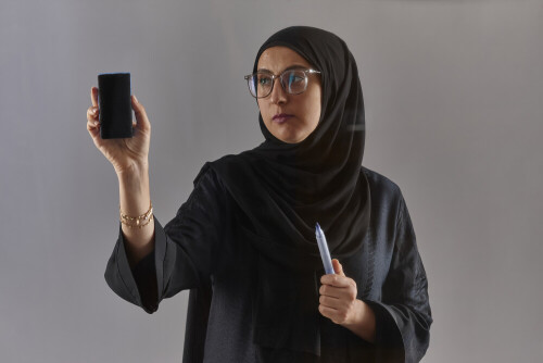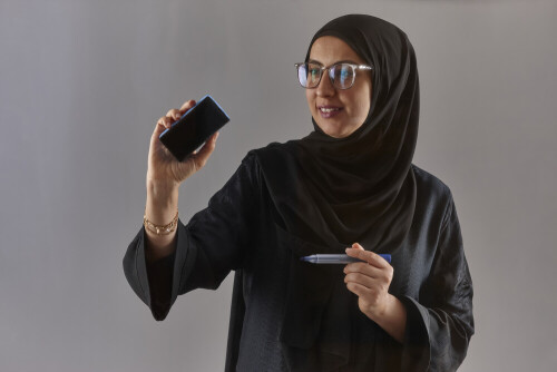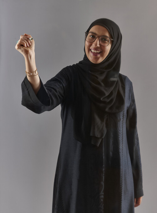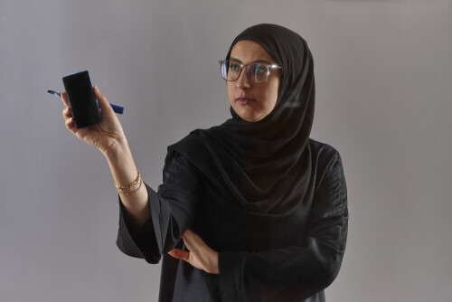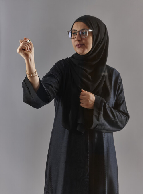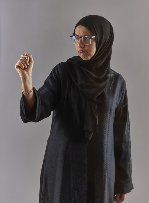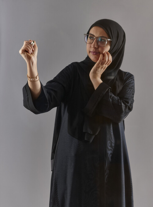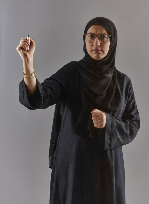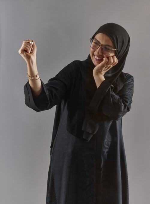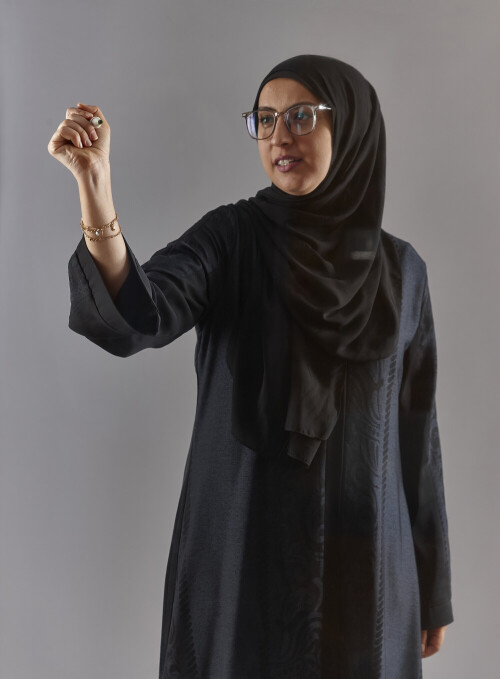 Woman in abaya writing on transparent board