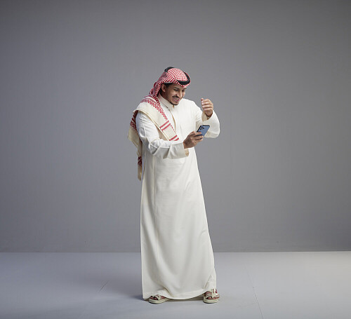 A Saudi man standing wearing thob and red shomag texting on phone on gray background