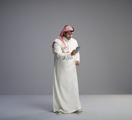 A Saudi man standing wearing thob and red shomag texting on phone on gray background