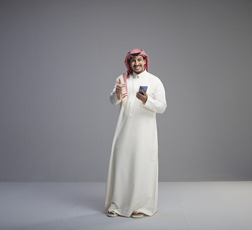 A Saudi man standing wearing thob and red shomag texting on phone on gray background