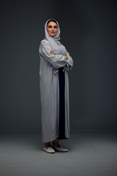 A Saudi woman wearing a light gray Abaya and head scarf standing and making multi poses eye level on a grey background