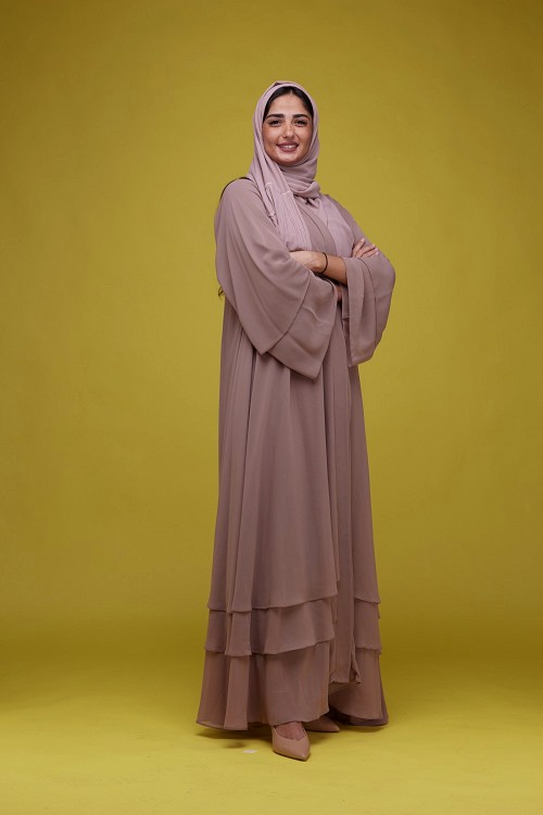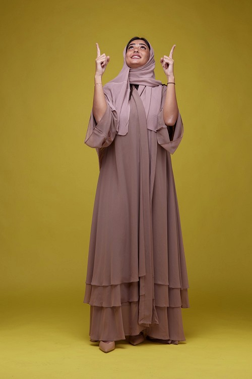 A woman Pointing on a Yellow Background wearing Brown Abaya with Hijab