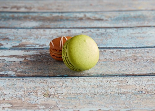45º Shot of of two assorted Brown Irish Cream, and Green Pistachio macarons on light blue background