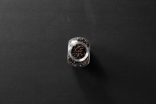 A glass spice jar full of black peppers on black flooring
