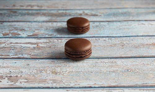 45º Shot of two Brown Dark Chocolate macarons on light blue wooden background