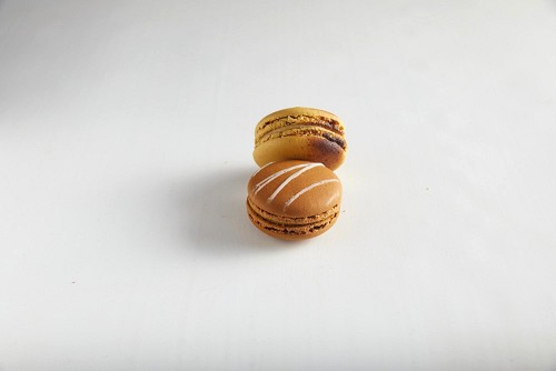45º Shot of of two assorted Brown Irish Cream, and Yellow Crème Brulée macarons on white background
