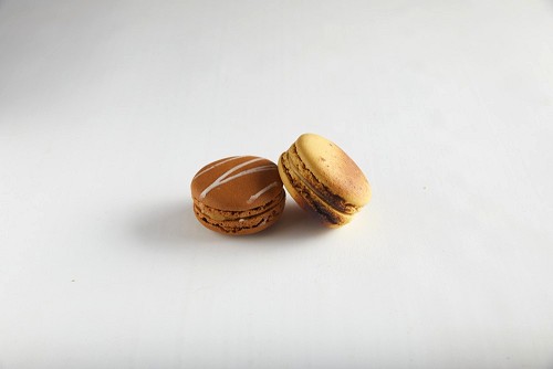 45º Shot of of two assorted Brown Irish Cream, and Yellow Crème Brulée macarons on white background