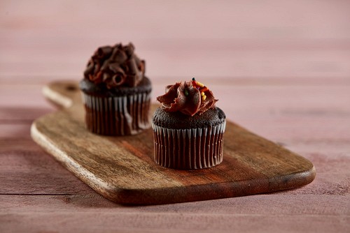 Chocolate mini cupcake topped with cream on a wooden board
