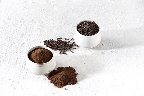 2 Beige ceramic bowls, one full of cloves and the other full of powder on textured white flooring
