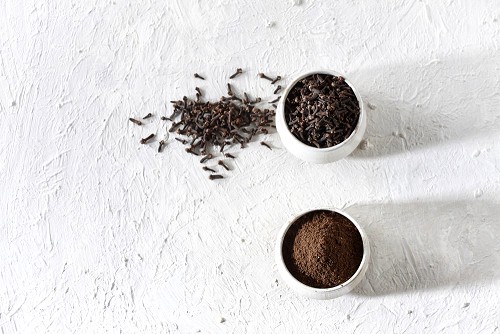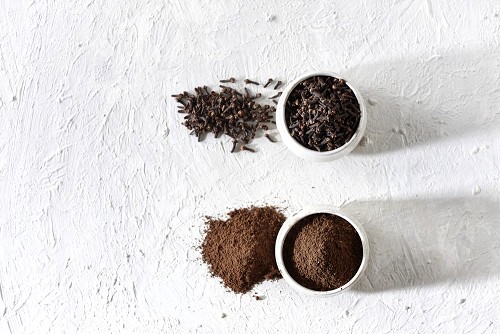 2 Beige ceramic bowls, one full of cloves and the other full of powder on textured white flooring
