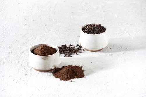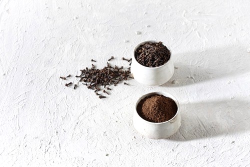 2 Beige ceramic bowls, one full of cloves and the other full of powder on textured white flooring