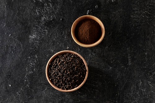 2 wooden bowls full of cloves powder and whole cloves on a textured black flooring