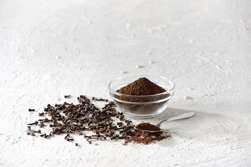 A glass bowl and a metal spoon full of cloves powder with cloves grains spread on a textured white flooring
