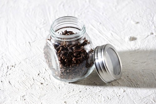 A flipped glass spice jar full of cloves and cloves came out of it on textured white flooring