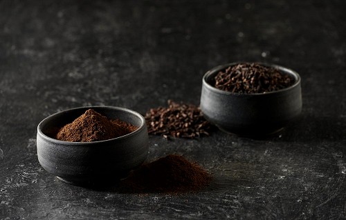 2 Black pottery bowls full of cloves and the other full of cloves powder on textured black flooring