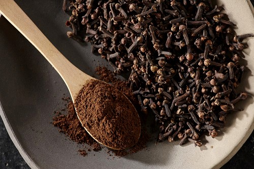 A Pottery plate full of cloves and a wooden spoon full of cloves powder on it on a textured black background