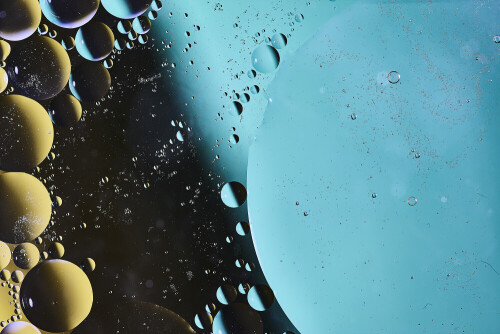 Close-ups of abstract oil bubbles on water surface in shades of black and yellow
