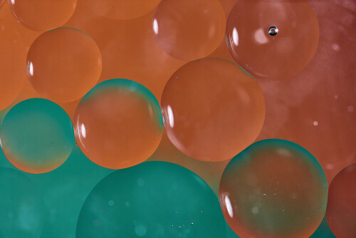 Close-ups of abstract oil bubbles on water surface in shades of green and orange