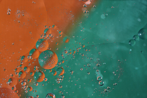Close-ups of abstract oil bubbles on water surface in shades of green and orange