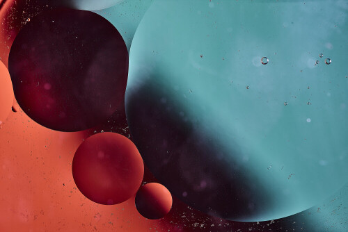 Close-ups of abstract oil bubbles on water surface in shades of green and orange