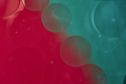 Close-ups of abstract oil bubbles on water surface in shades of green and red