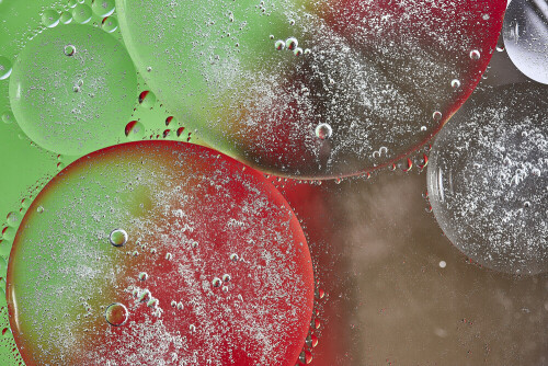 Close-ups of abstract oil bubbles on water surface in shades of brown, green and red