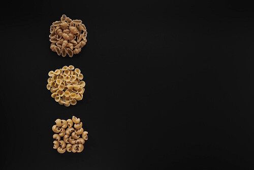 Different pasta types in 3 bunches on black background