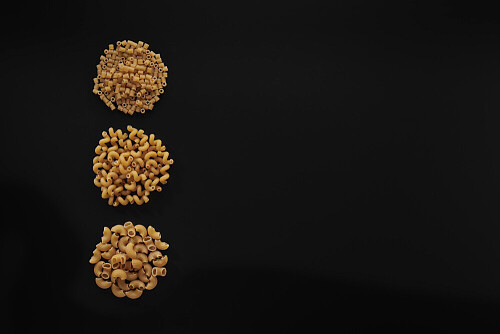 Different pasta types in 3 bunches on black background