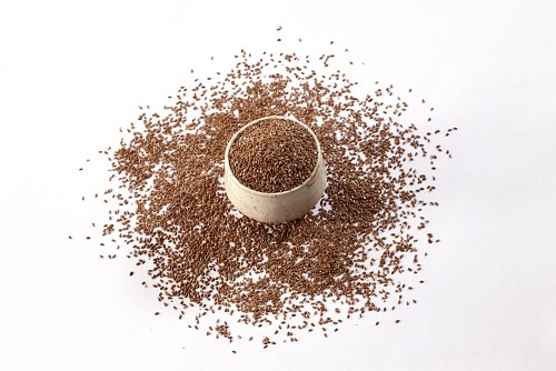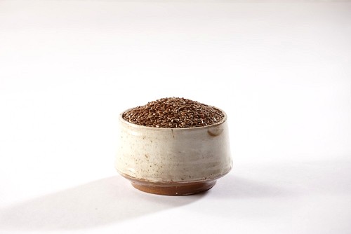 A pottery beige bowl full of flax seeds and more seeds spread on a white flooring