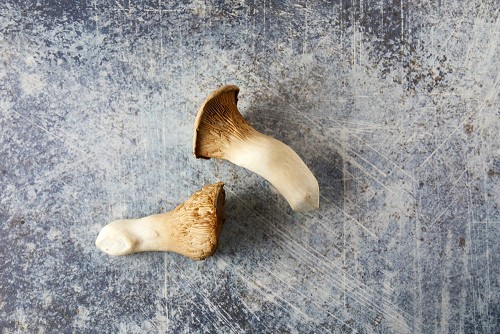 Fresh King oysters mushrooms topview on a light blue wooden background