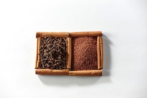 2 squares of cinnamon sticks full of garden cress and cloves on white flooring