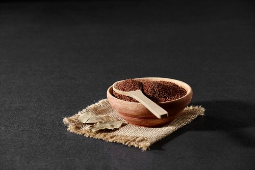 A wooden spoon full of garden cress seeds and seeds spread beside it on a black flooring