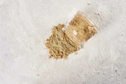 A glass jar full of ground ginger powder flipped with some spilling powder on white background