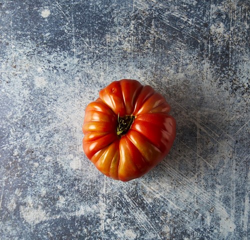 Single Topview Heirloom Tomato on a textured rustic blue background