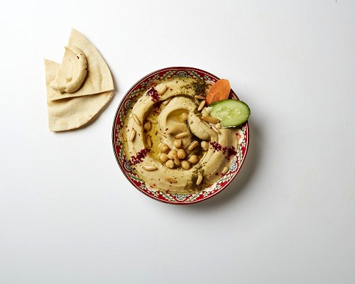 Hummus in a red plate with patterns garnished with zaatar & sumak on a white background