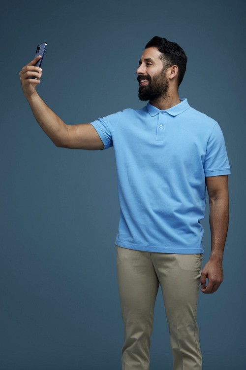 Man Taking a Selfie in a blue background wearing a Blue shirt
