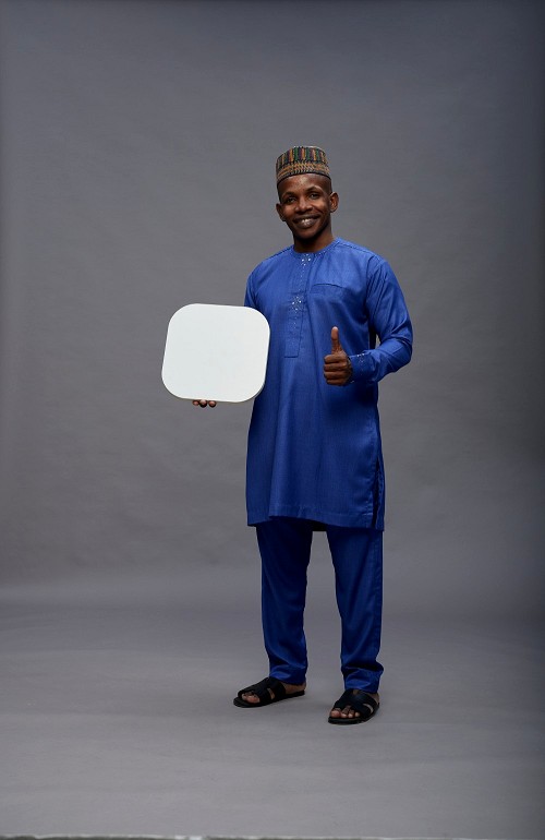 Man wearing Nigerian outfit standing holding social media sign on gray background