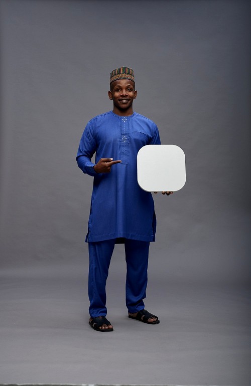 Man wearing Nigerian outfit standing holding social media sign on gray background