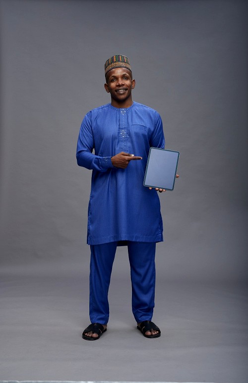 Man wearing Nigerian outfit standing showing tablet to camera on gray background