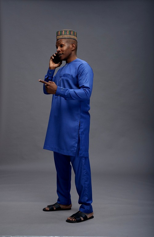 Man wearing Nigerian outfit standing talking on phone on gray background