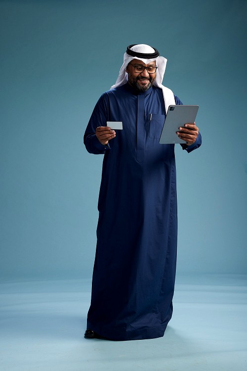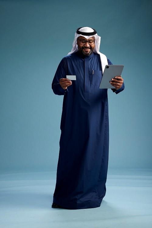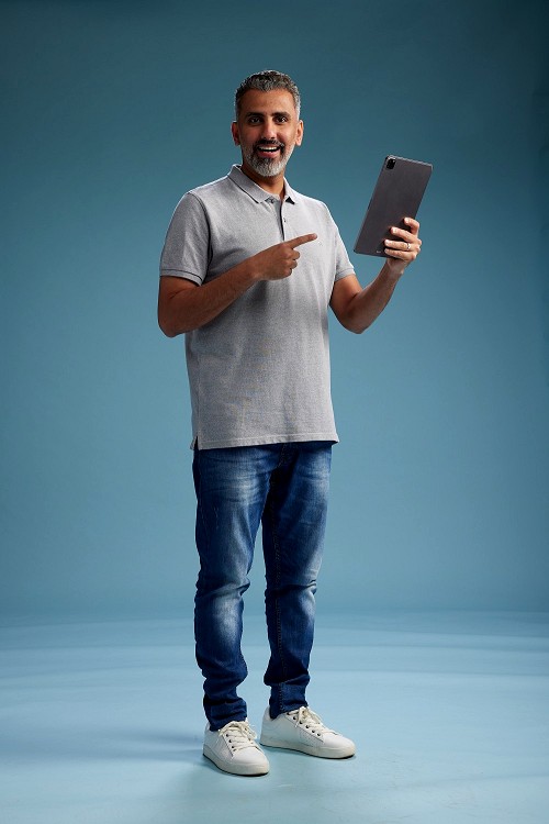 Man Standing working on tablet on blue background