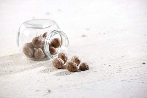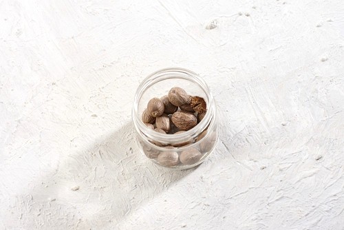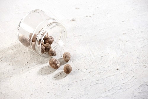 A glass jar full of nutmeg flipped and the seeds spread out on a textured white flooring