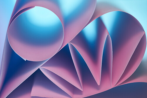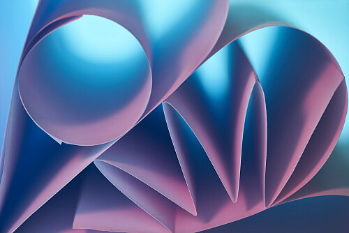 The image shows an abstract paper art with circular shapes in varying shades of blue