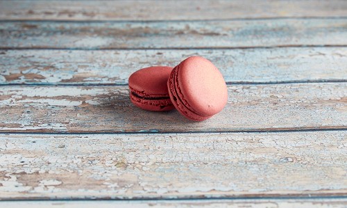45º Shot of two Pink Raspberry macarons on light blue wooden background