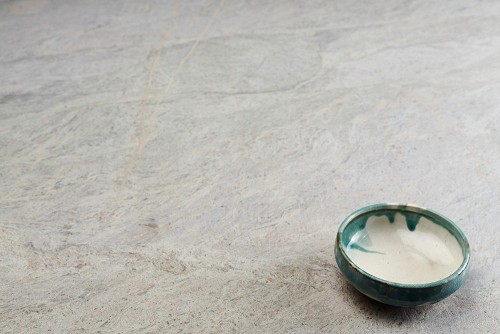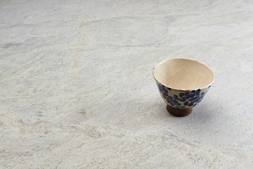 A multicolored pottery bowl on grey marble background