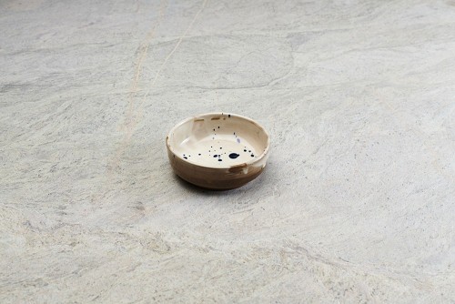 A multicolored pottery bowl on grey marble background