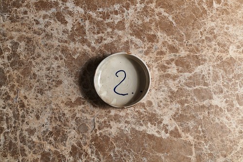 A multicolored pottery bowl on beige marble background